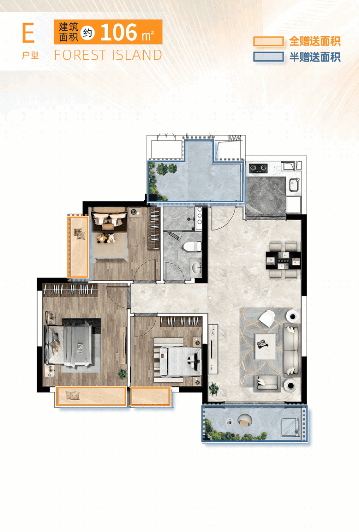 128.58㎡的 G 户型,三房两卫,能满足全家人的居住需求。入户花园一半面积是赠送的,简直太划算了。全屋四开间朝南,南北双阳台,生活和诗意都能兼顾。早上在阳光中醒来,心情都格外舒畅。主卧是套房式设计,独立卫浴、衣帽柜、工作 / 化妆间、大飘窗一应俱全。厨房在北角,早上做饭也不会打扰家人休息。为了方便老人,长者房设置在南侧一角,紧邻阳台,方便老人晨练。整个户型的生活动线设计得非常贴心。