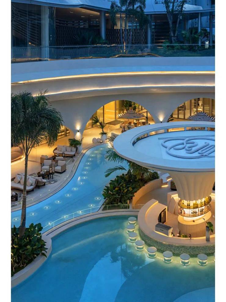迪拜风情的社区会所——海晏艺术会所以文艺复兴时期的著名画作《维纳斯的诞生》为灵感,巧妙地将花雨艺术符号贯穿整个设计之中,成功打造了一个融合了文艺复兴韵味与自然人文氛围的独特空间。会所的外观设计采用了白色曲线拱券风格,中间穿插着泳池,蓝白相间的色彩搭配营造出一种宁静而放松的氛围。作为国内首家引入迪拜风情设计的社区会所,它不仅带来了同纬度地区的气候特点,还增添了一抹异国情调。