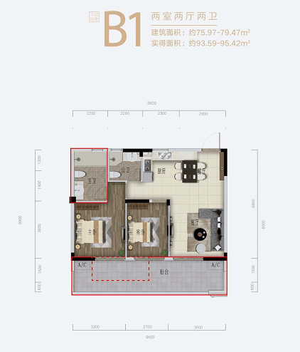 (1)75-79㎡两房两厅两卫一阳台