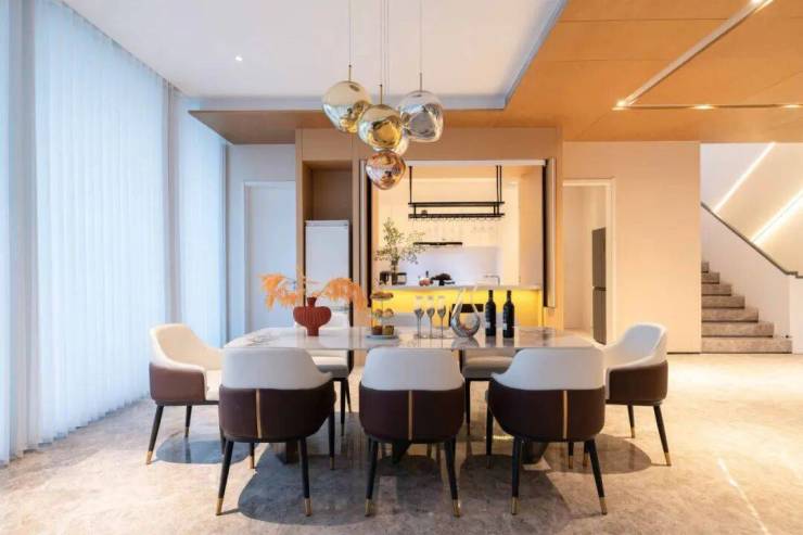 开放式客厅+现代化厨房+吧台+泳池庭院