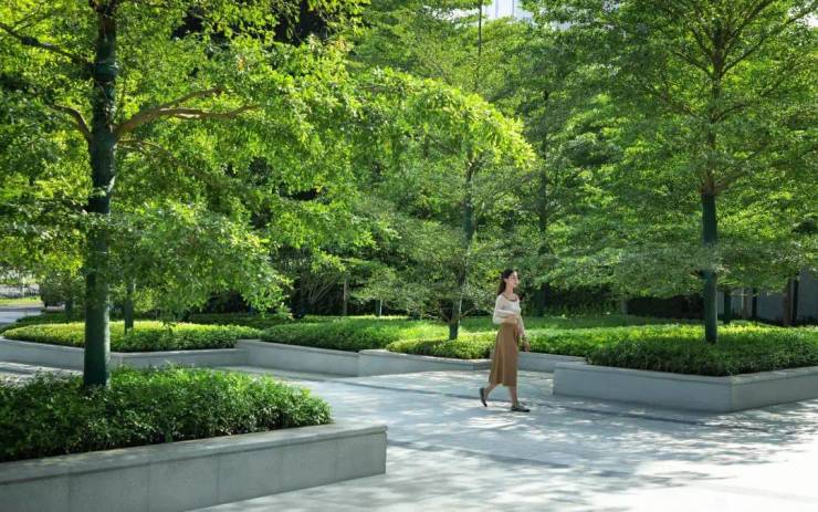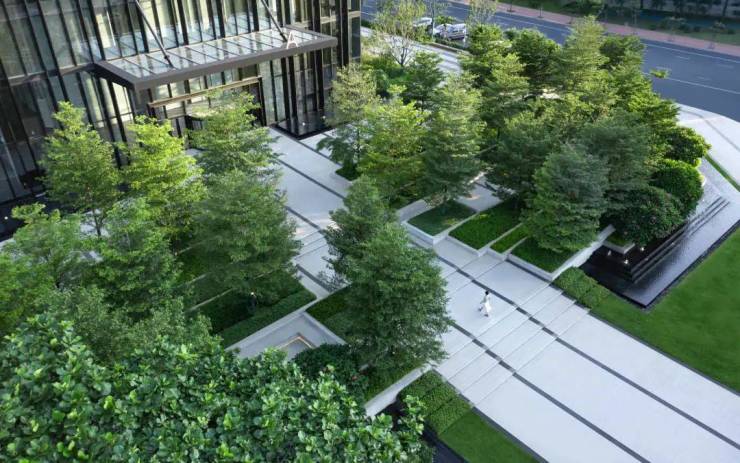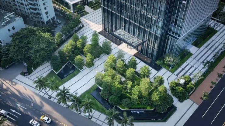 入口区与城市的主干道接壤。海口招商局大厦采用31棵精品小叶榄仁,营造了一处纯粹的森林边界,也是森林式办公设计精神最直接的传达。