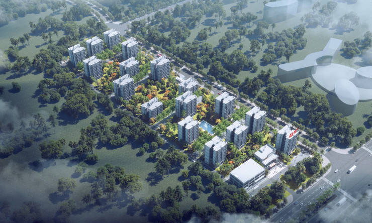 荣宸·祥庭以满足人们对现代居住环境所要求的舒适性、健康性、生态性、安全性和经济性为出发点,为了实现以人为本为中心,以整体社会效益、经济效益与环境效益三者统一为基准点,整体建筑布局为南北朝向,于九龙大道沿街设置住宅及农贸市场。