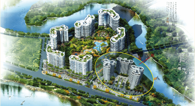 整个地形似龙头状,三面环河,河中有一小岛,站在楼顶,极目远眺,可见连绵不断的群山环绕,楼盘西面背靠五指山脉,是“前有照,后有靠”,的上风上水之地。与水为邻,伴水而居,能够修养身心,涤荡心灵。