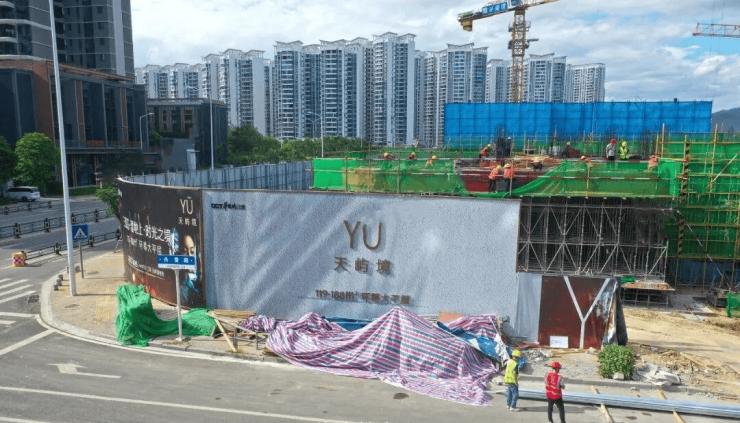 从航拍的视角看,工地内有挖掘机、塔吊机、运输车等在施工,有4栋住宅已冒出地面,1栋地基已打好。