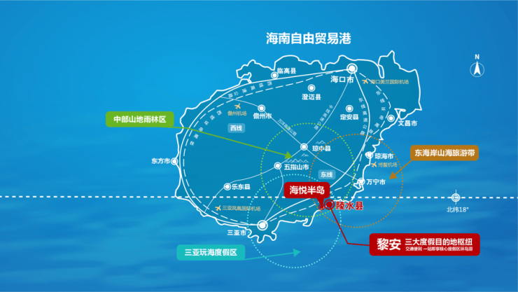 昊瑞·海悦半岛项目位于海南陵水文黎大道与中心大道交汇处,距G98环岛高速黎安互通约5公里,距陵水动车站约7.7公里,距离三亚凤凰机场约71公里。从项目出发,开车约1小时到三亚市区,约2个半小时到海口市区;陵水站乘动车22分钟抵达三亚市区,75分钟可到海口市区,项目路网发达,海陆空畅连全岛、全国。
