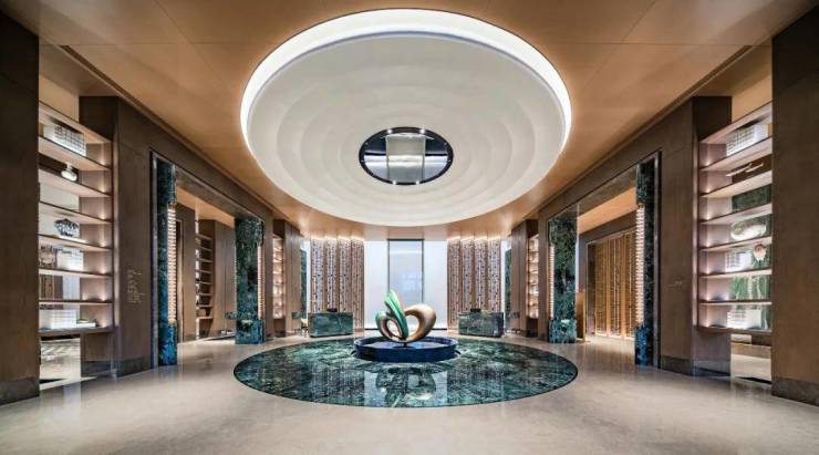 圆形顶部天花与普拉达绿地面石材、景观雕塑相呼应,不仅拉伸视觉维度更彰显出奢华感。