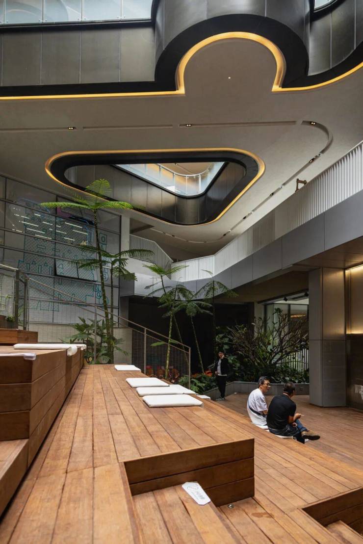 踏入东岸麓洲,仿若步入热带梦幻之境。在这里,商业空间与自然完美交织。森林湖泊环绕的 “玻璃盒子” 中,户外竹木地板与墙板随处可见。竹材与海芋、面包树等绿植相得益彰,砗磲点缀其中,巧妙隔开外界喧嚣,带您轻松步入宁静商业天地。