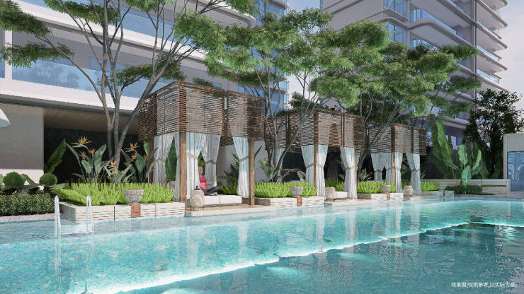 秉承热带隐奢酒店泳池场景美学,泳池旁绿意掩映,设置休闲廊亭、躺椅等,泳池内规划亲子按摩池、家庭泳池等分区,集聚、停、憩、赏为一体,享受避世的休闲和海岛休闲日常。