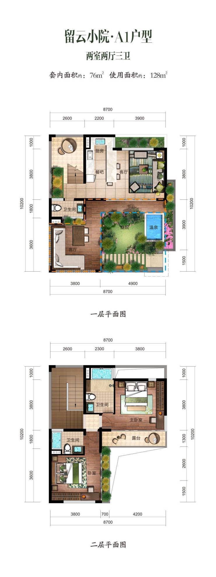 A1留云小院,套内面积约76㎡,使用面积约128㎡,220万起,两房两厅三卫,可改三房,海南稀缺小别墅,独门独院设计,一层大面积私家庭院,带温泉泡池,半敞开客厅,双卧套间。