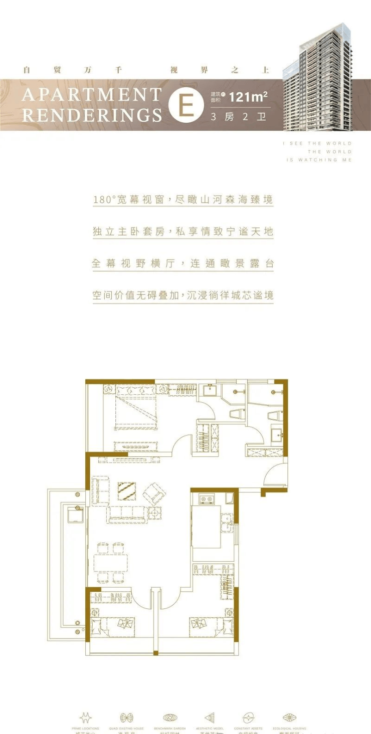 E户型:建筑面积约121㎡的三室两厅两卫。6米宽的大横厅设计,连接瞰景露台,山河海景,尽收眼底;客餐厅一体,空间奢阔舒适,阳台配备洗衣机位,提高生活舒适度;卫生间带明窗,干湿分离;独立主卧套房,躺在床上即可观一线海景。
