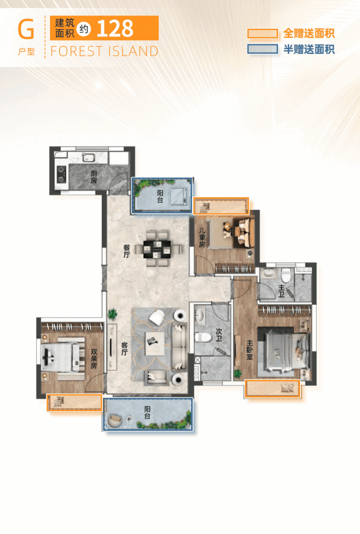 128.58㎡的 G 户型,三房两卫,能满足全家人的居住需求。入户花园一半面积是赠送的,简直太划算了。全屋四开间朝南,南北双阳台,生活和诗意都能兼顾。早上在阳光中醒来,心情都格外舒畅。主卧是套房式设计,独立卫浴、衣帽柜、工作 / 化妆间、大飘窗一应俱全。厨房在北角,早上做饭也不会打扰家人休息。为了方便老人,长者房设置在南侧一角,紧邻阳台,方便老人晨练。整个户型的生活动线设计得非常贴心。