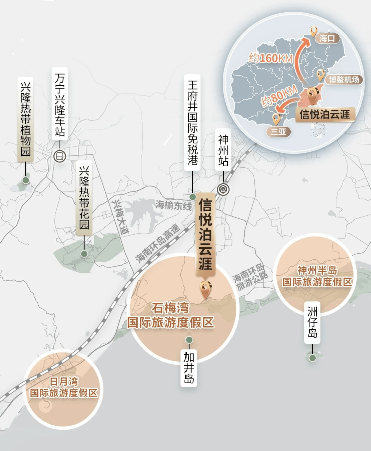 毗邻高铁神州站、万宁站,畅享便捷生活圈,速通博鳌机场、三亚凤凰机场、海口美兰机场;接驳环岛高速、环岛旅游公路,多维出行体验,繁华自然随心所享。