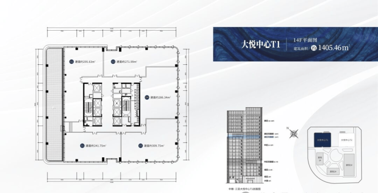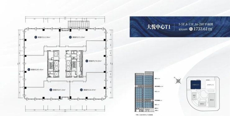 【楼栋信息】:大悦中心T1,城市之光,高度88米,共20层,总建筑面积约3万㎡,在售户型建面约:267-316㎡,6梯6户,标准层高约4.2米。